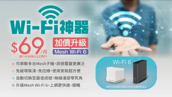 升級Mesh Wi-Fi 6,每月僅需$69(適用於150M以上方案)。提升家中Wi-Fi覆蓋範圍,解決訊號死角,享受更穩定的無線網路體驗。